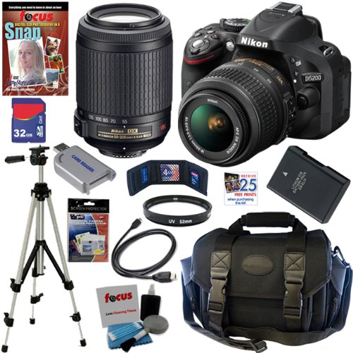 - Nikon D5200 24.1 MP CMOS Digital SLR Camera Body (Black) - Nikon 18-55mm f/3.5-5.6 AF-S DX VR NIKKOR Zoom Lens - Nikon 55-200mm f/4-5.6G ED IF AF-S DX VR Zoom-Nikkor Lens - 52mm UV Protection Filter