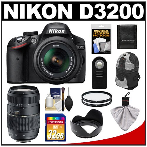 | Nikon D3200 Digital SLR Camera & 18-55mm G VR DX AF-S Zoom Lens (Black) with 70-300mm Lens + 32GB Card + Backpack + Filters + Remote + Accessory Kit |