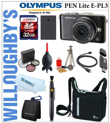 Olympus PEN Lite E-PL3 with 17mm f/2.8mm Lens (Black) + Extra Battery + Deluxe Bag + 3pc 37mm Multi-Coated Essential Filter Kit + 32GB SDHC Deluxe Kit Details :